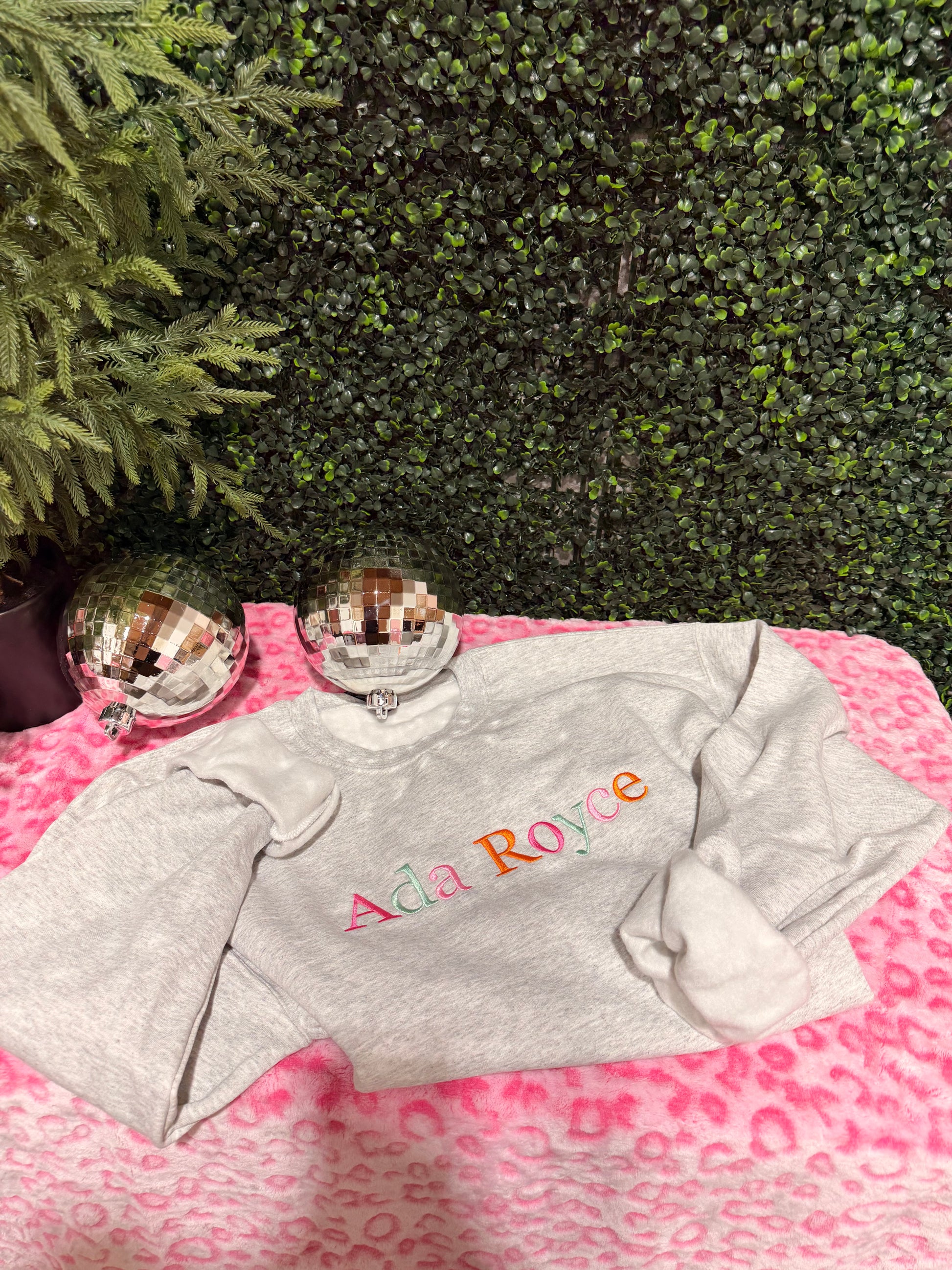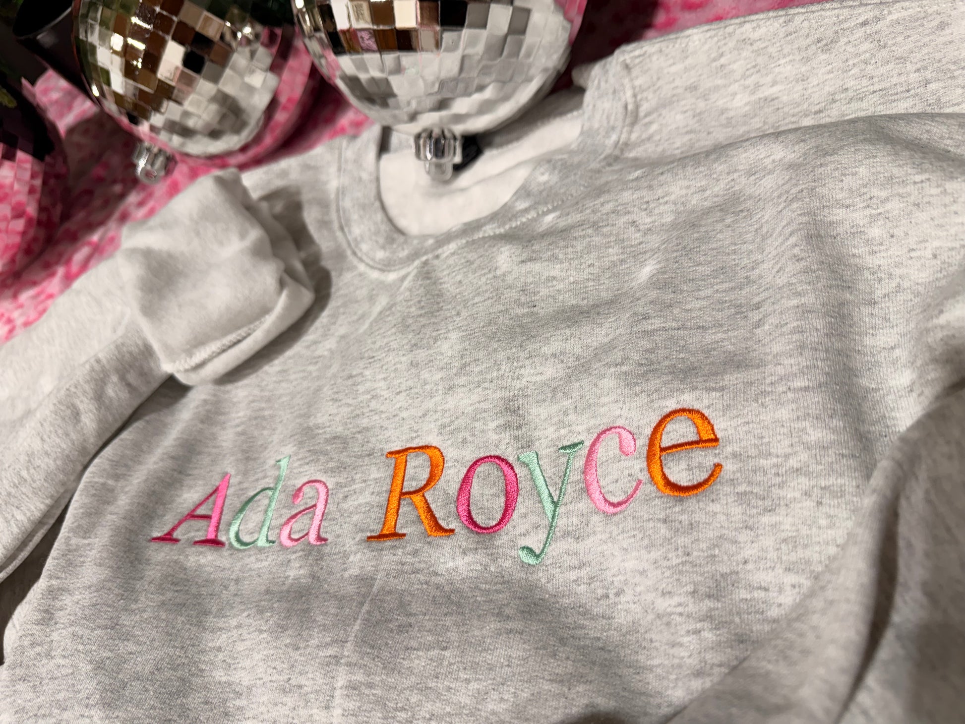 This heather-gray sweatshirt brings laid-back comfort and boutique flair together in one easy layer. Crafted from a soft, mid-weight fleece, it feels like your favorite off-duty uniform the moment you slip it on. The star of the show is the embroidered “Ada Royce” lettering across the front, stitched in playful, candy-bright hues that pop just enough without shouting.