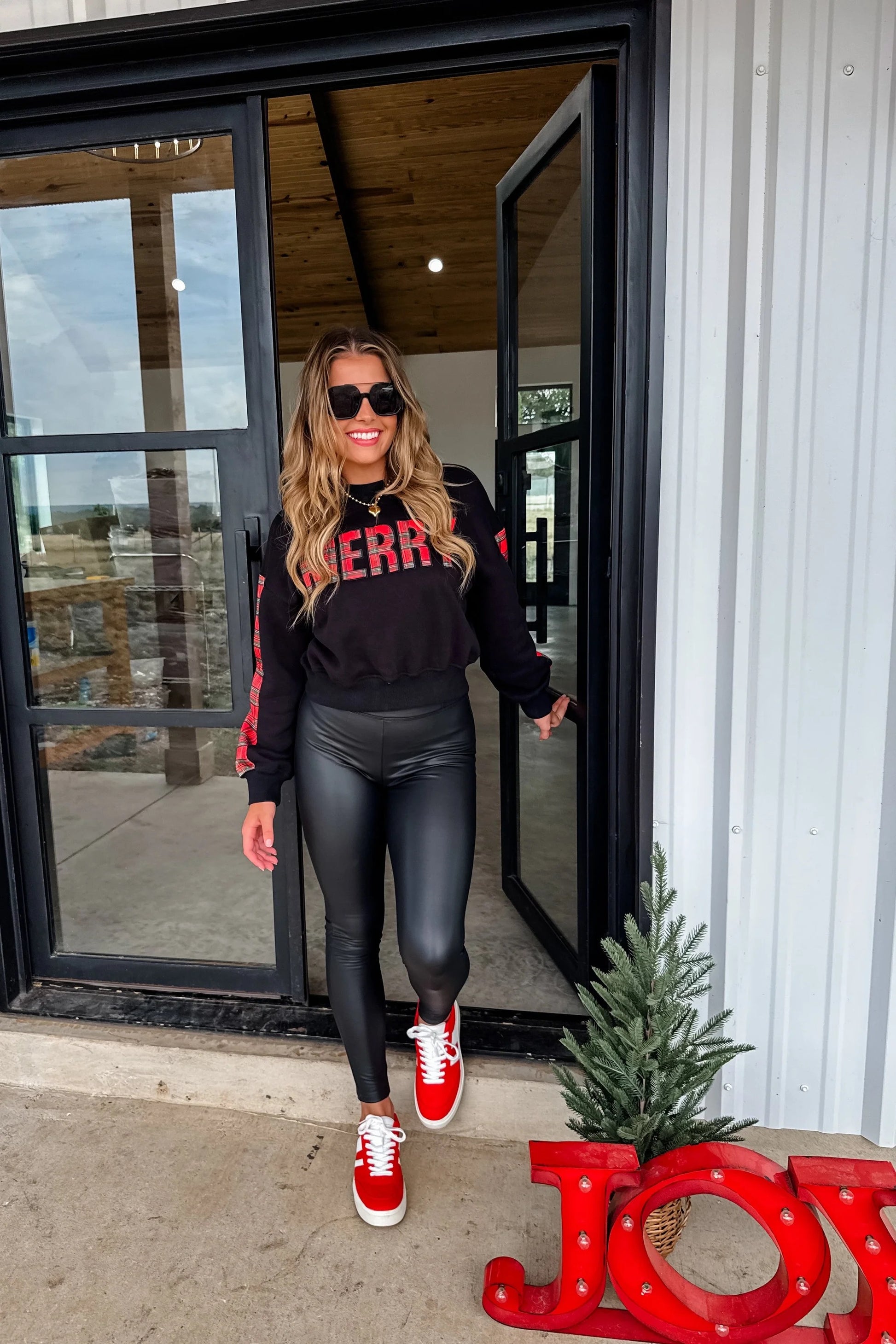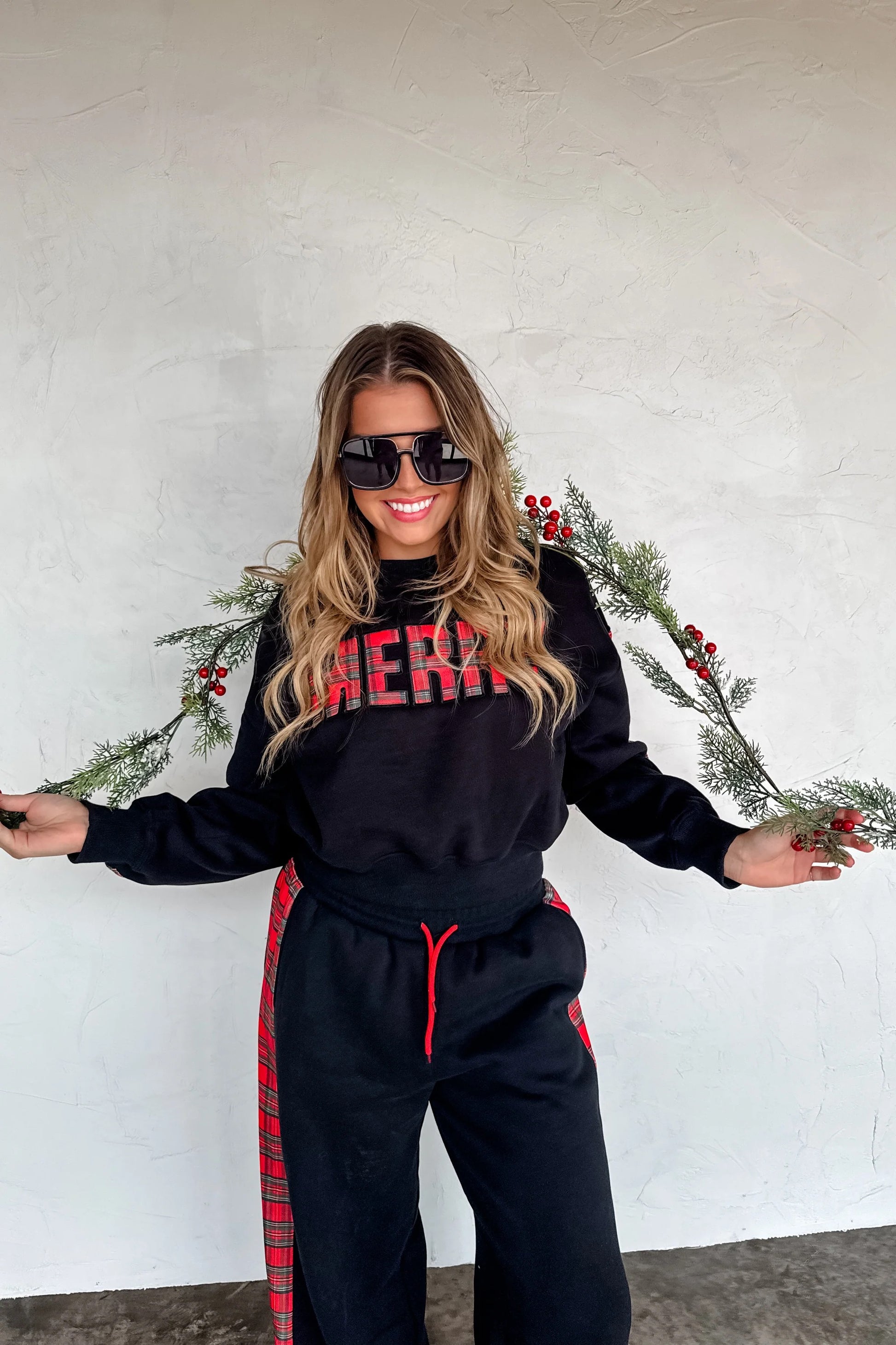 This matching black lounge top serves cozy confidence with a festive twist. The top features bold plaid lettering that spells “Merry”, matched with plaid accents down the sleeves for that subtle-but-playful holiday vibe. The relaxed fit keeps things comfortable, while the ribbed cuffs give the sweatshirt a polished, put-together feel.