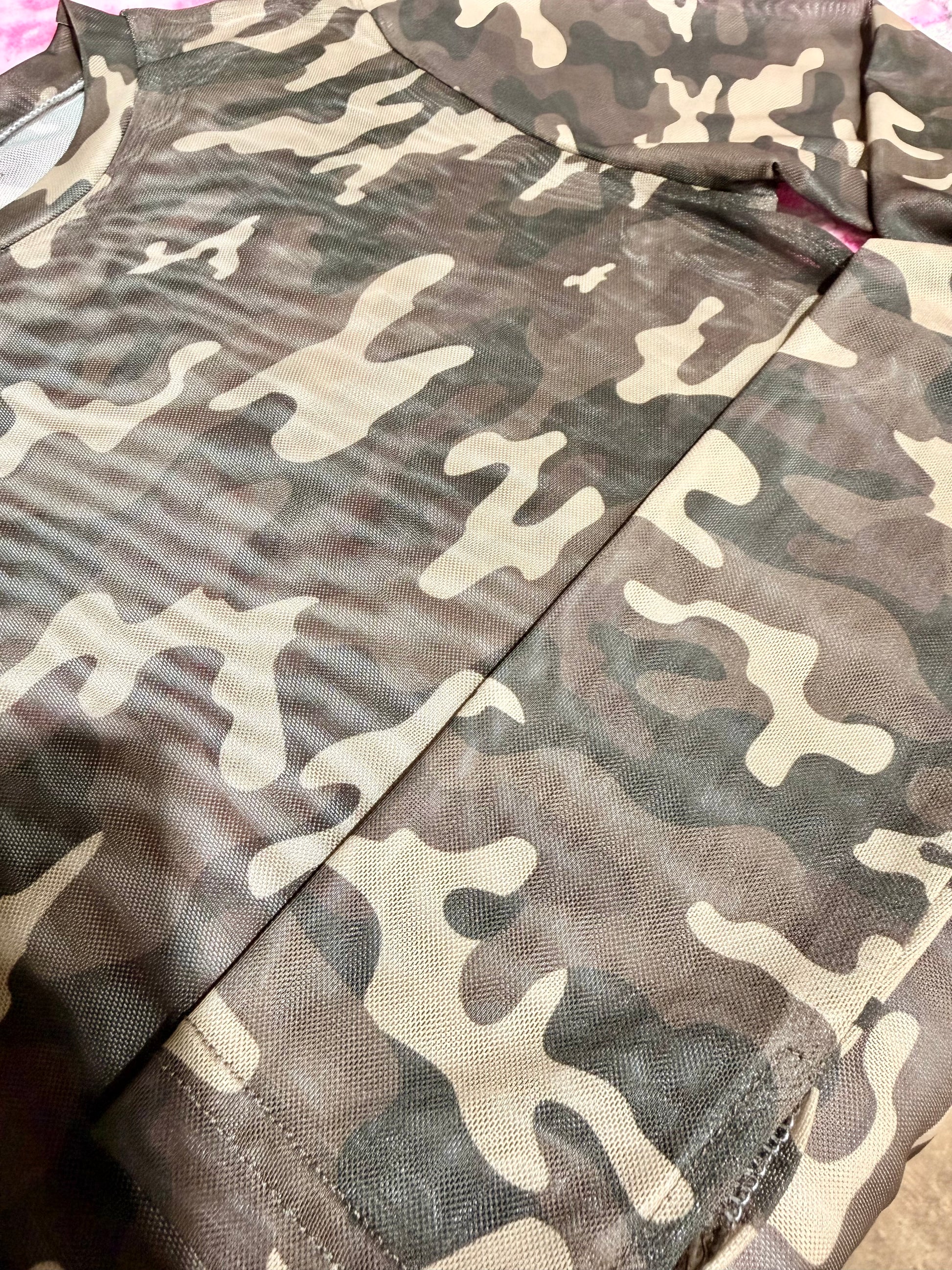 The semi-transparent mesh fabric hugs softly while letting skin or layers peek through, making it ideal over a bralette, tank, or under a jacket. The neutral camouflage print keeps it versatile while still serving attitude.