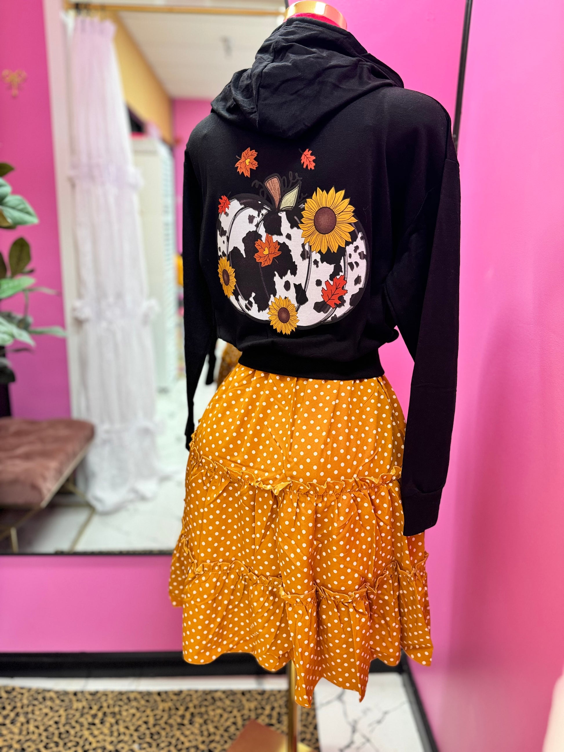 Get cozy and festive all at once with this black fleece zip-up hoodie — the ultimate blend of fall flair and farm-chic attitude. The front keeps things simple with a small cow-print pumpkin patch adorned with sunflowers and autumn leaves, while the back turns up the charm with a bold, full-sized version of the same design.