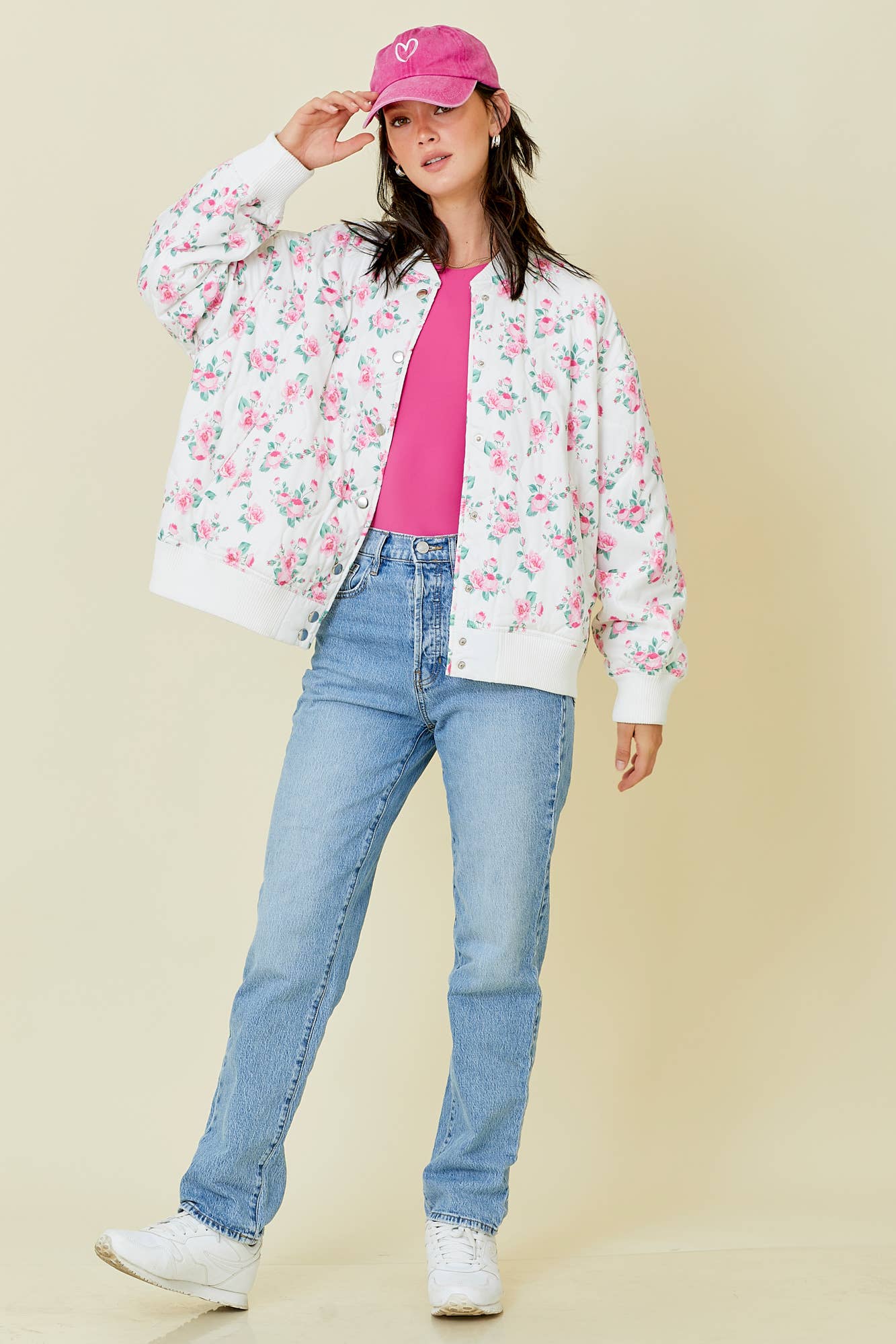 Covered in a sweet pink rose print on a crisp white background, it blends vintage inspo with modern comfort. The soft quilted texture brings lightweight warmth, while ribbed cuffs, a snap-button front, and a relaxed bomber-style fit keep things casual and effortlessly cool.