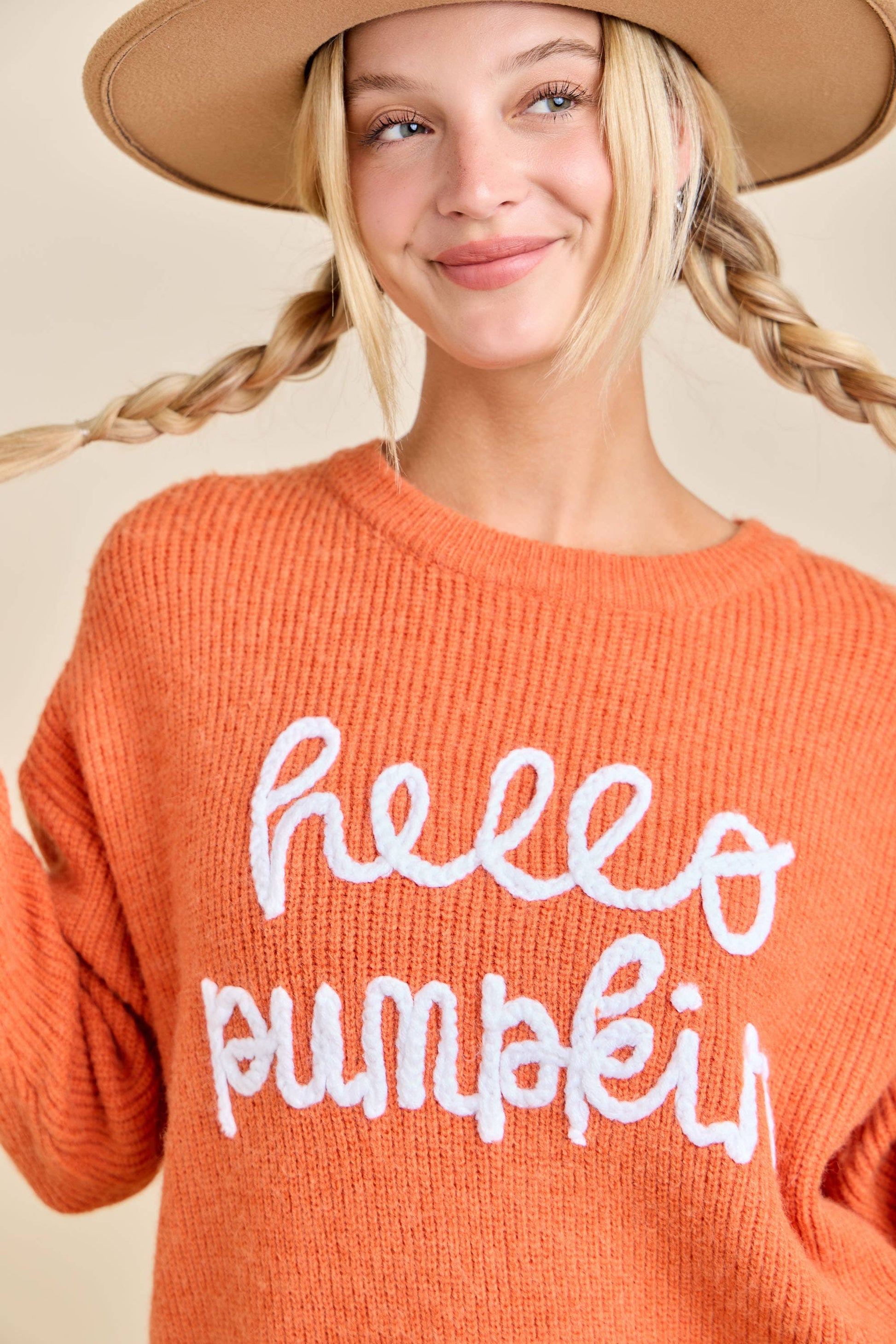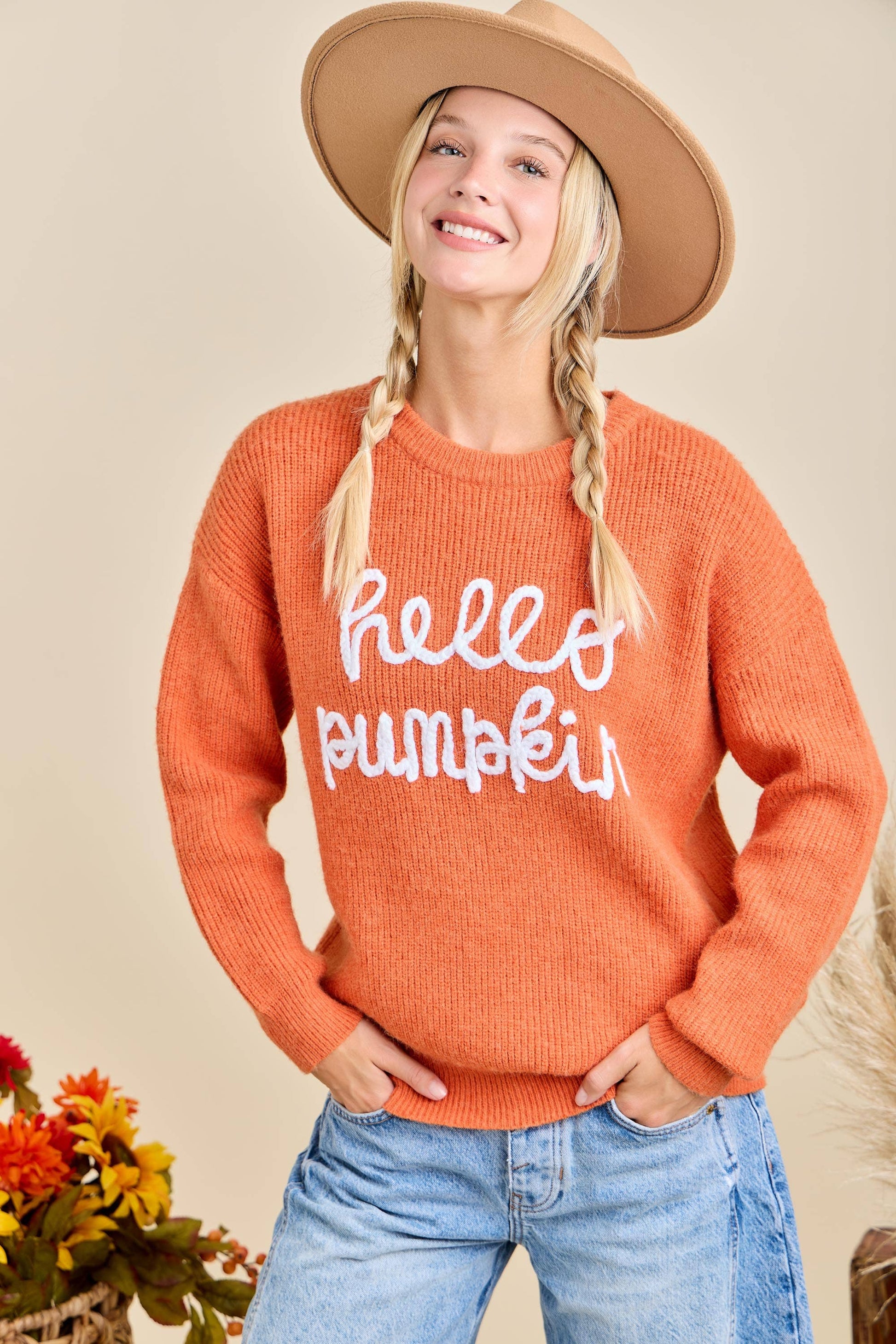 Say hello to fall fashion with our Hello Pumpkin sweater! This quirky and playful 100% acrylic crochet sweater features a loose fit and round neck for maximum comfort. Perfect for cozy nights by the fire or pumpkin patch adventures. (Pumpkin spice latte not included.)