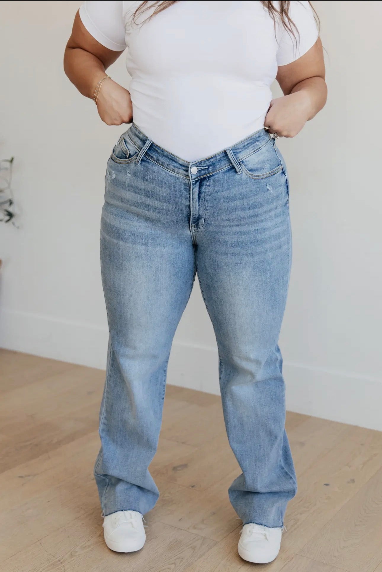 Get ready to redefine your denim game with these High Rise V Front Waistband Straight Jeans from Judy Blue! The V-front waistband tapers down offering a flattering fit while the 4-way stretch and raw hem add style and comfort. Plus, the light wash and straight leg make these jeans a wardrobe must-have.