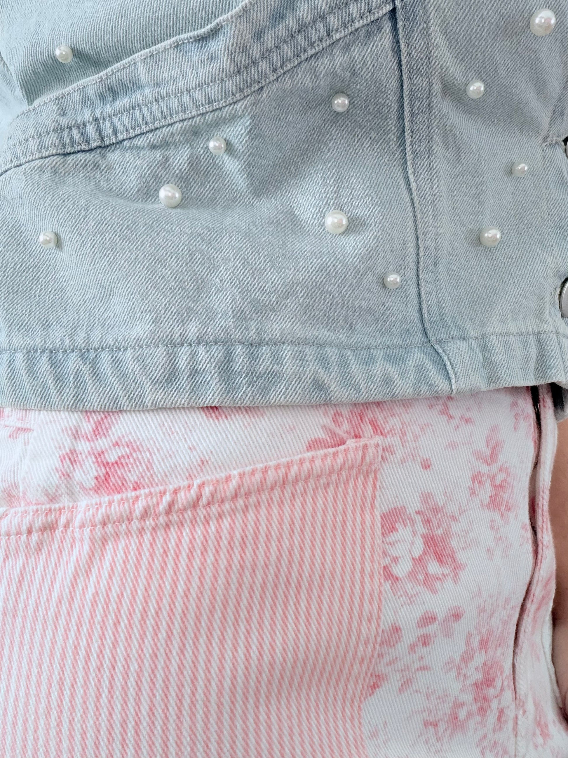 Add texture, charm, and a little sparkle to your wardrobe with this pearl-embellished denim vest. Crafted from soft, lightweight denim in a fresh pastel wash, this piece blends classic structure with feminine detailing for an effortlessly polished look.