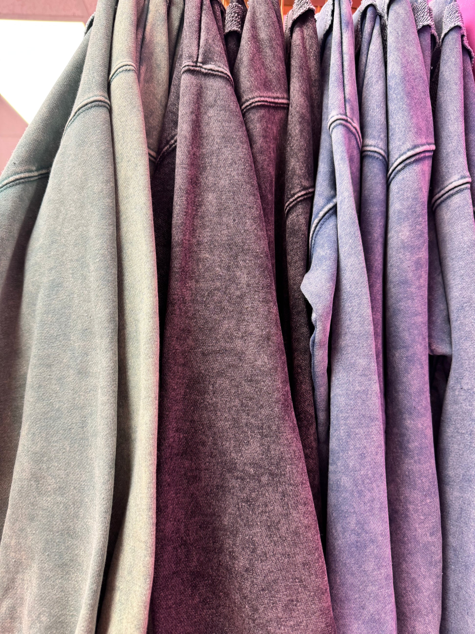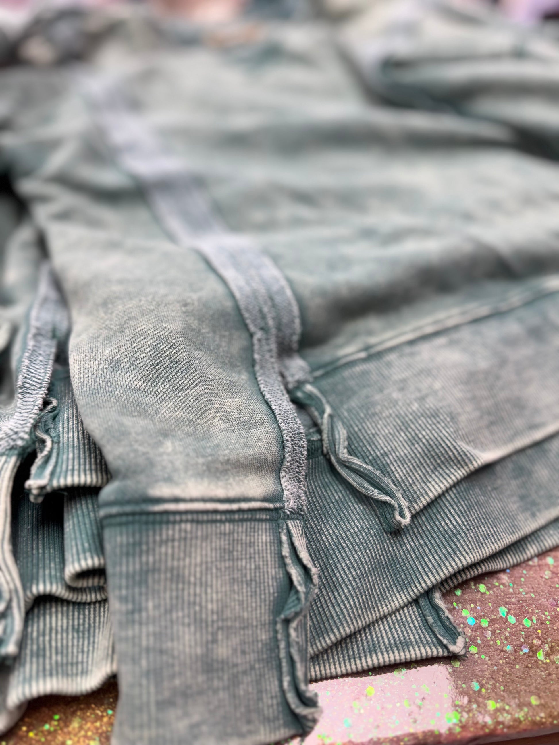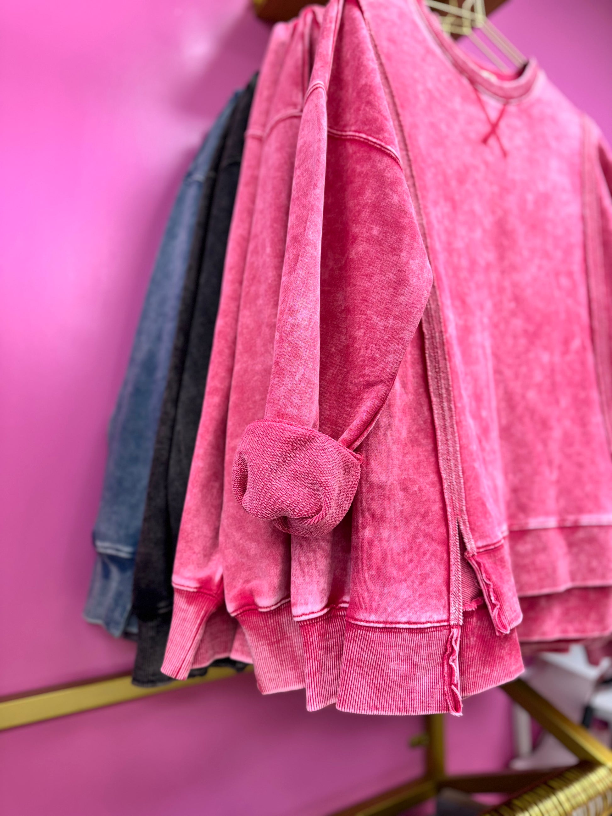 Meet your new favorite laid-back essential. This vintage-washed seafoam green, bubblegum pink, denim blue, and washed black sweatshirt delivers that effortlessly lived-in look with a modern twist. The raw seam detailing and asymmetrical panel give it a touch of edge, while the ribbed cuffs, hem, and neckline keep it classic. Soft, cozy, and perfectly oversized — ideal for coffee runs, couch hangs, or pretending to be productive on a Sunday.