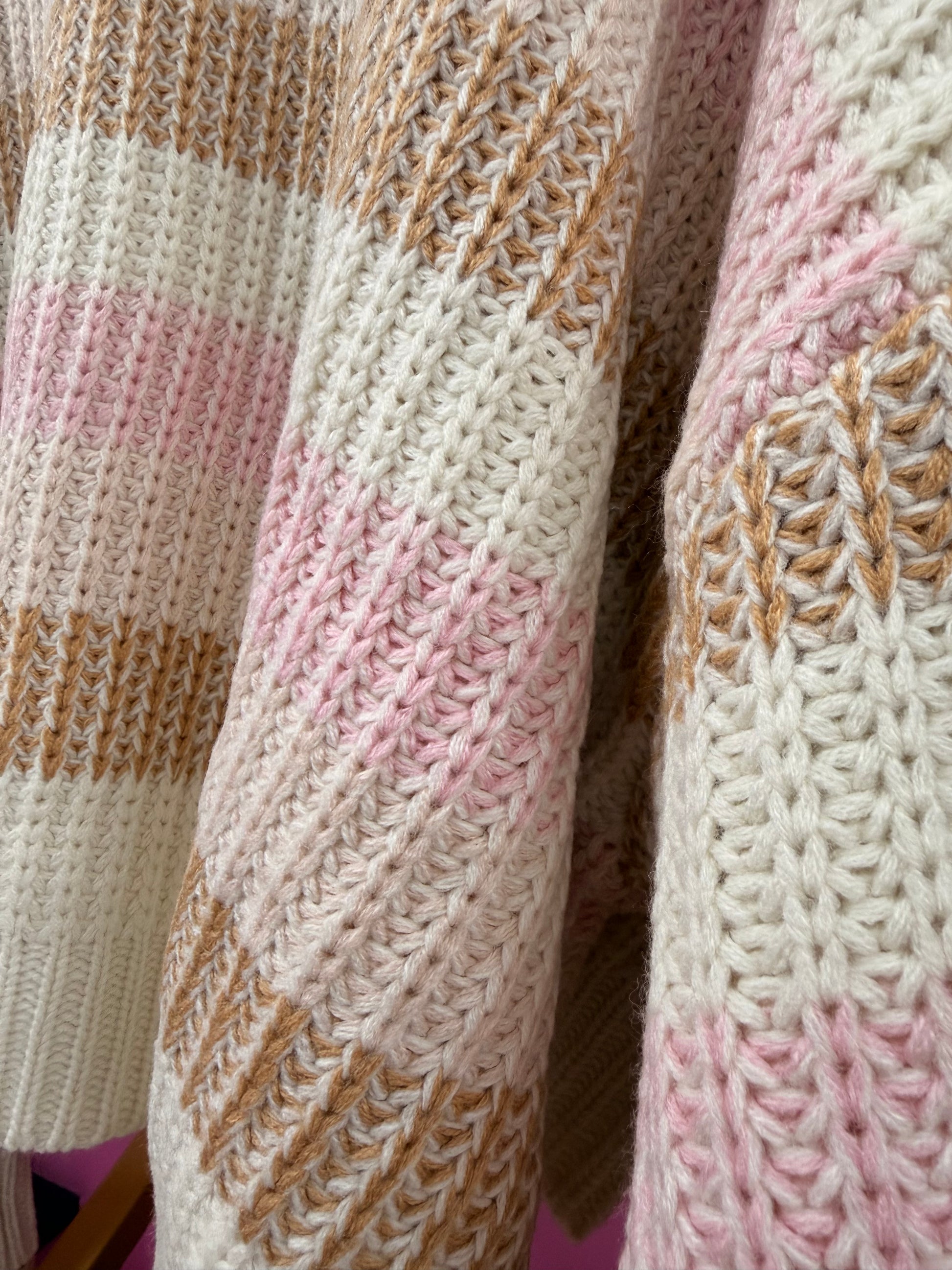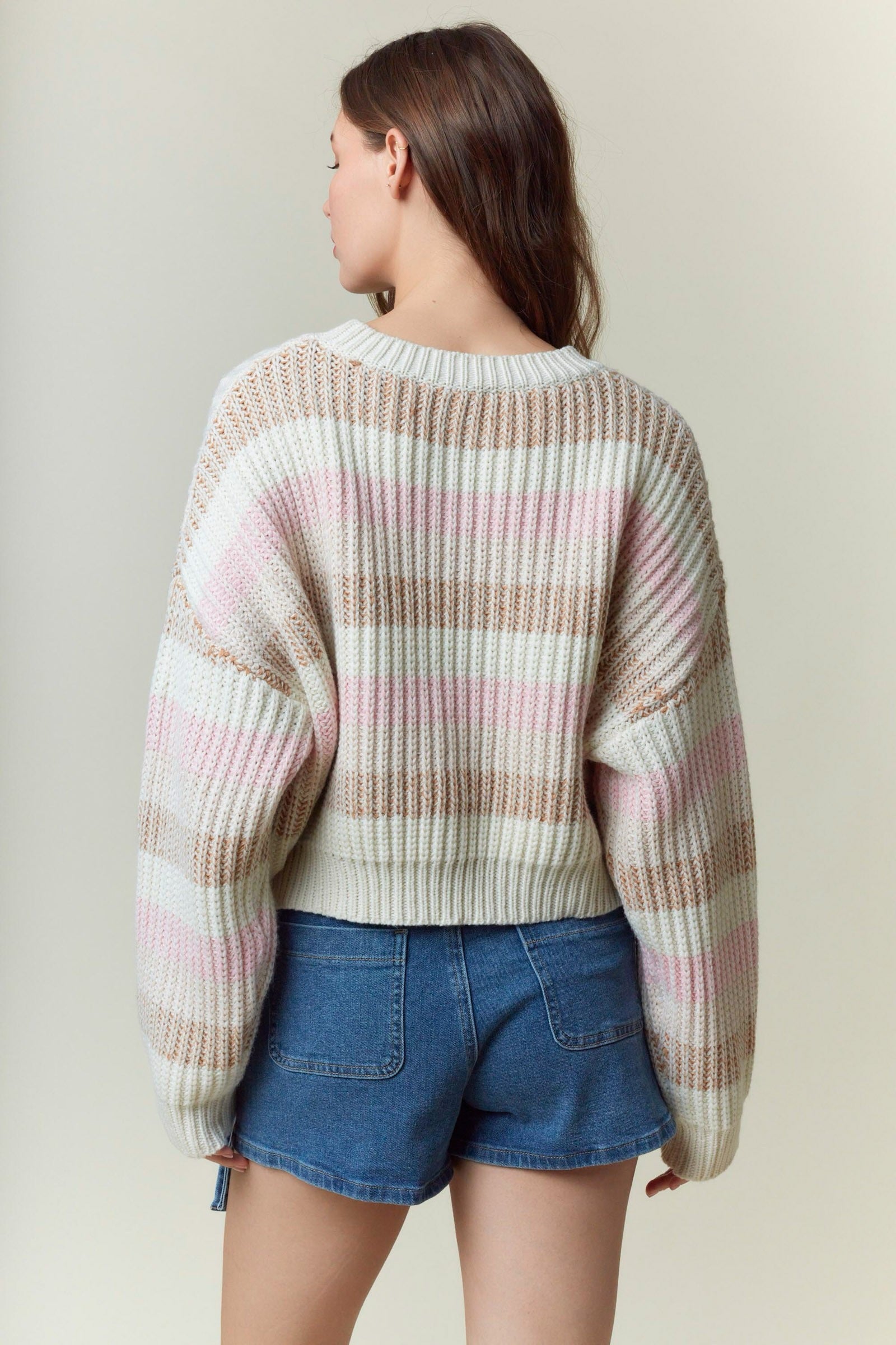 Soft as a bakery cloud and cute enough to cause compliments on contact. This cropped knit sweater features wide horizontal stripes in creamy ivory, blush pink, and warm oat brown. The chunky ribbed texture gives it that hand-knit, cuddle-me energy, while the relaxed drop-shoulder fit keeps things effortlessly cool.