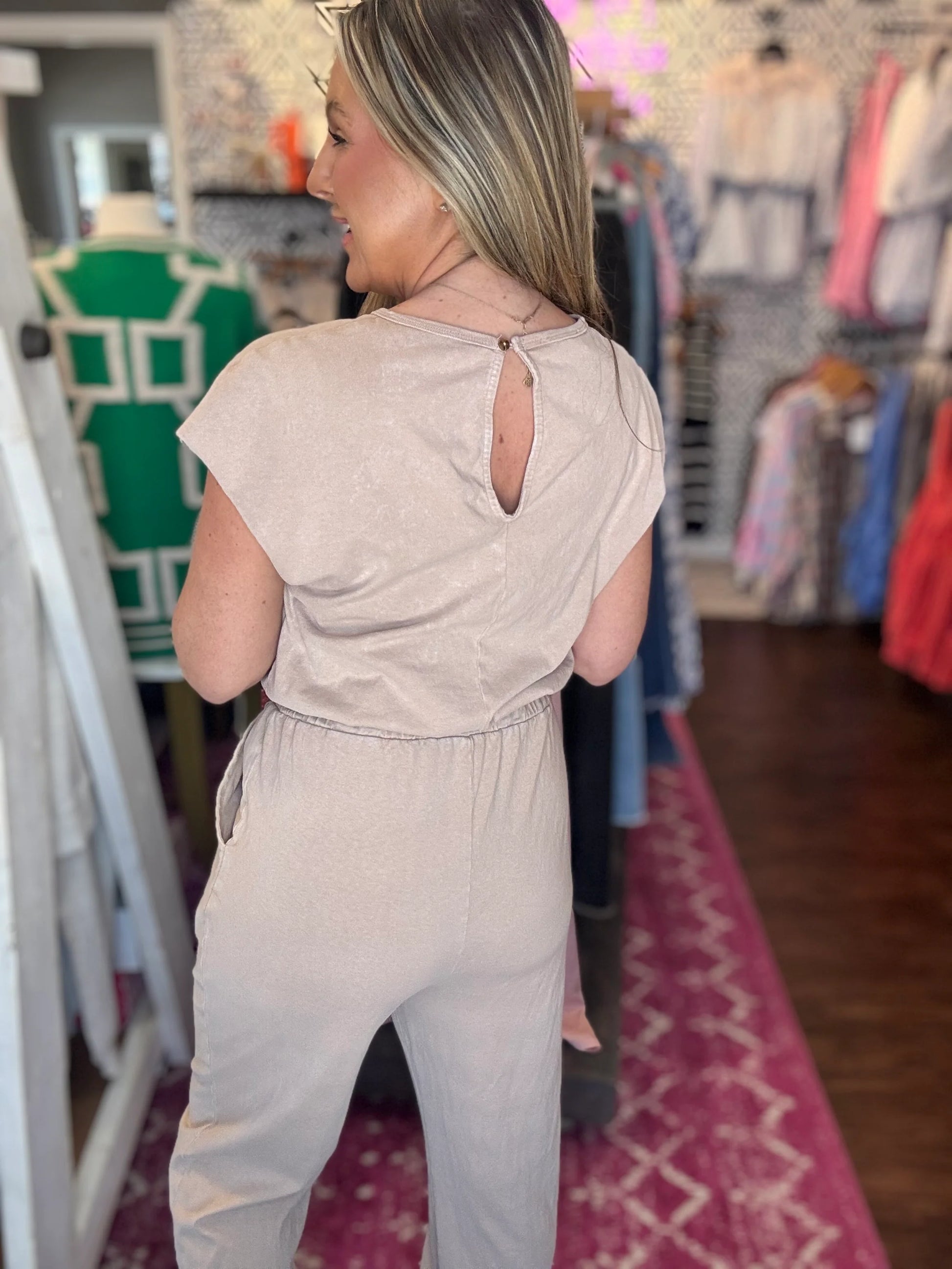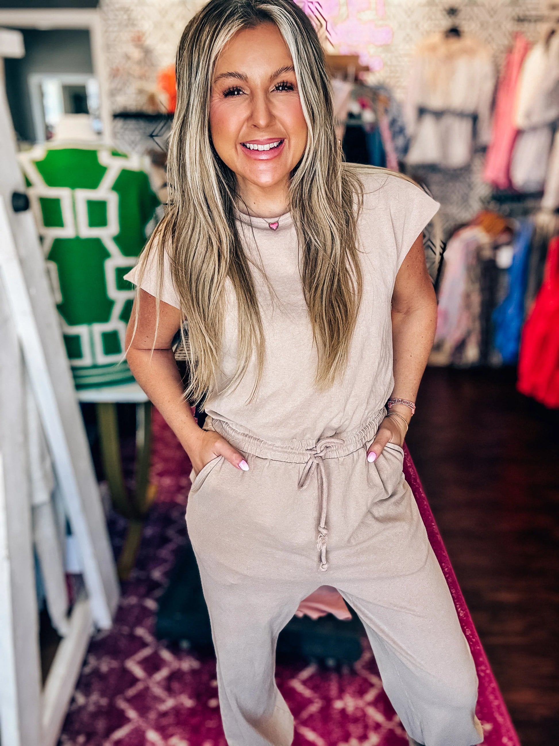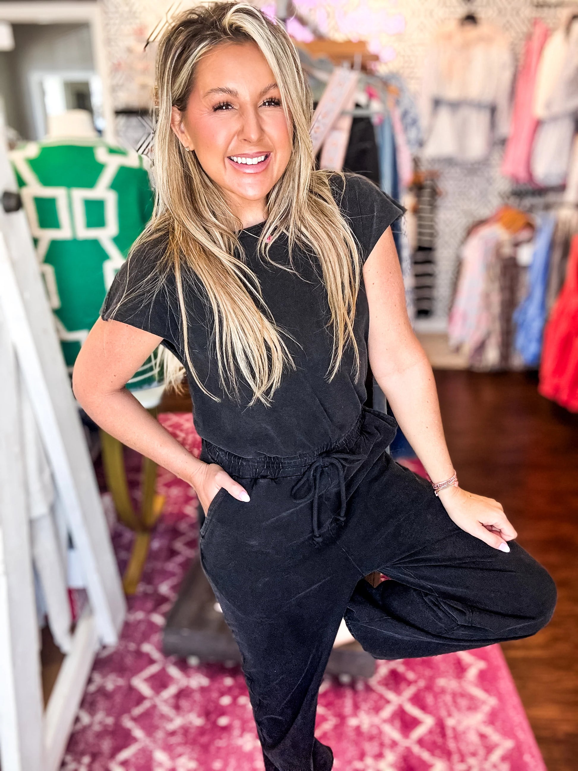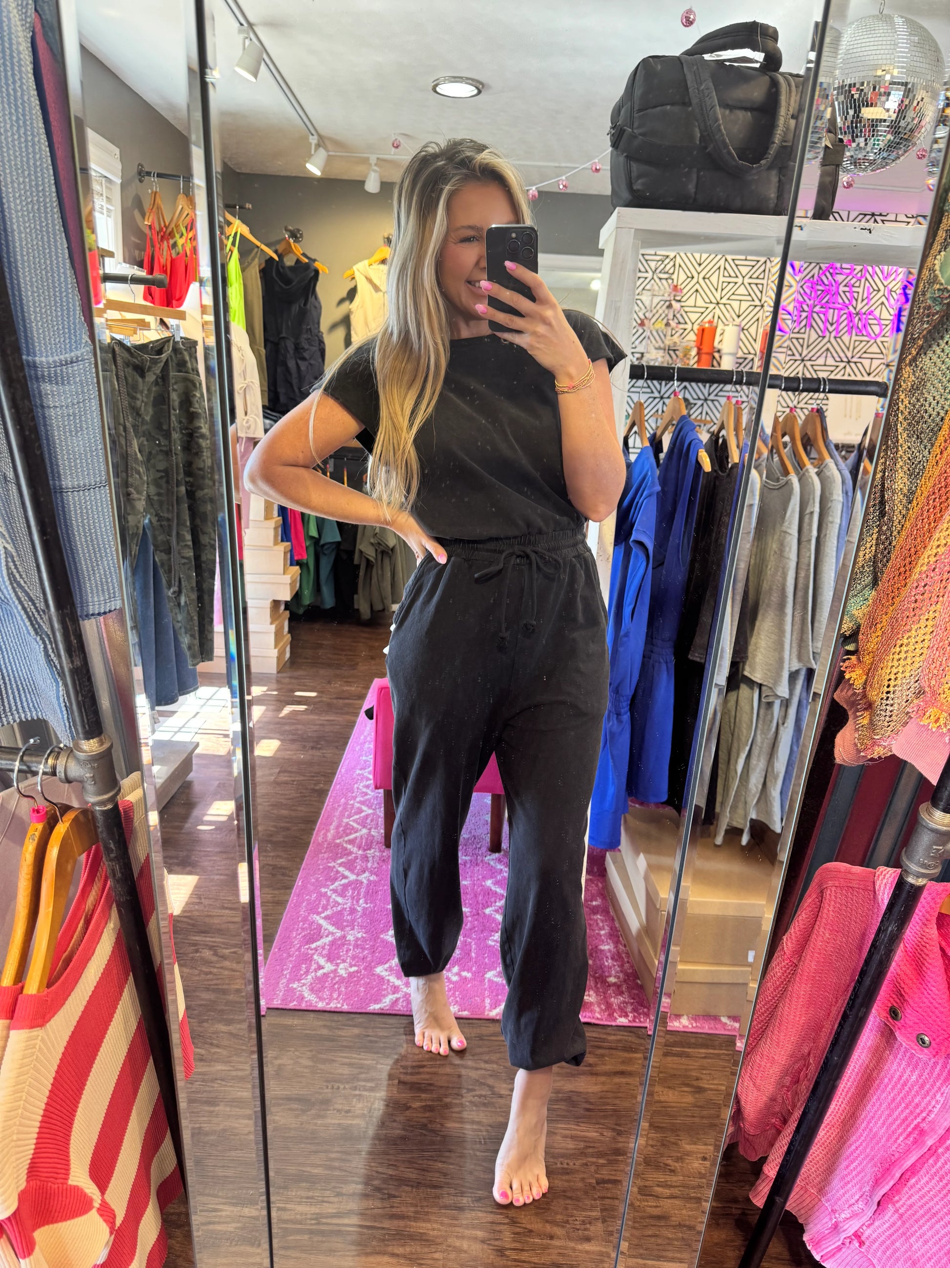 Stay in style, thanks to this jumpsuit. The top of jumpsuit offers a round neckline, short sleeves, and a relaxed fit. Turn around to reveal back keyhole detailing. The bottom of jumpsuit features a drawstring waist with a high-rise and cuffed pant legs.
