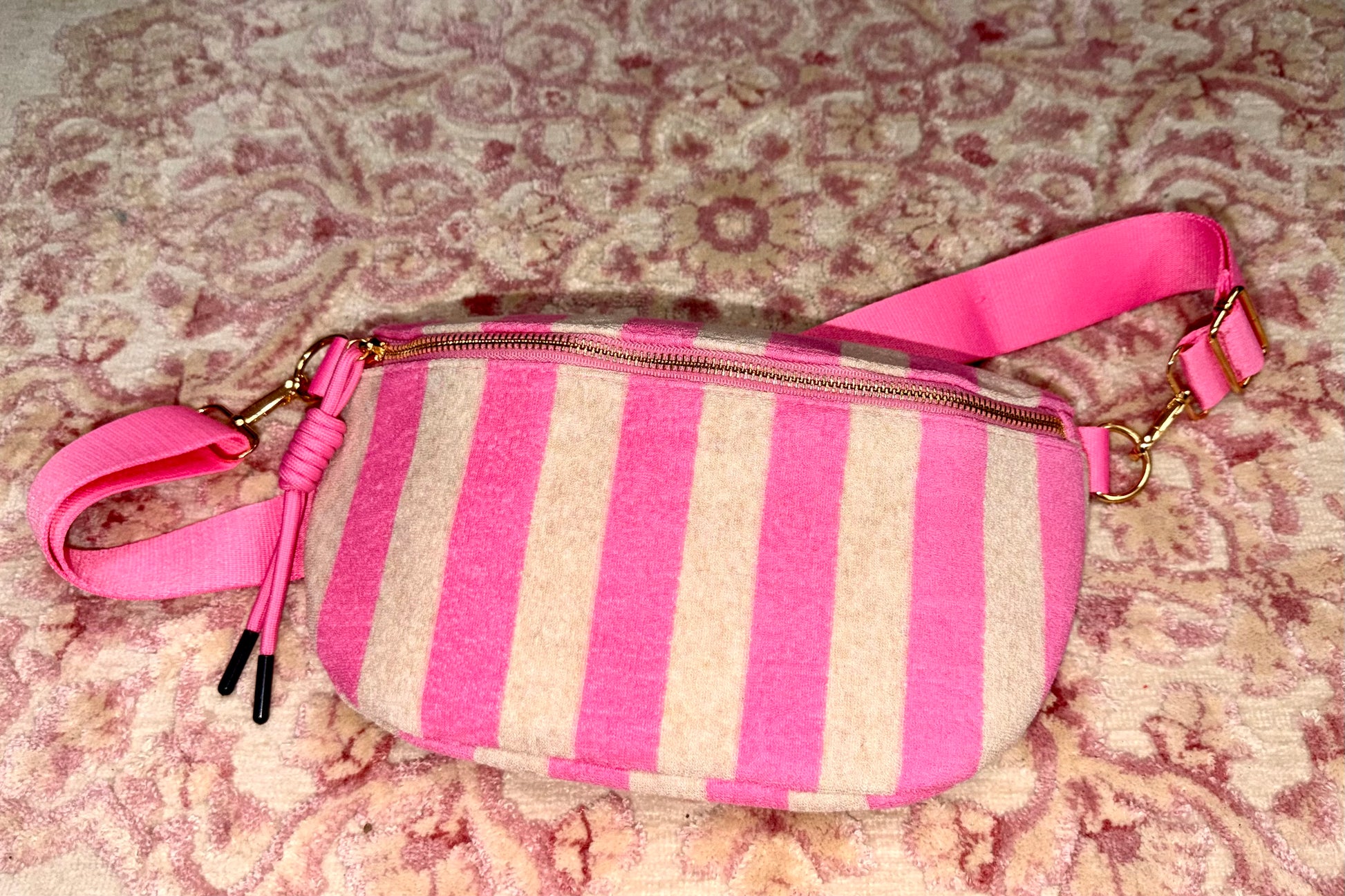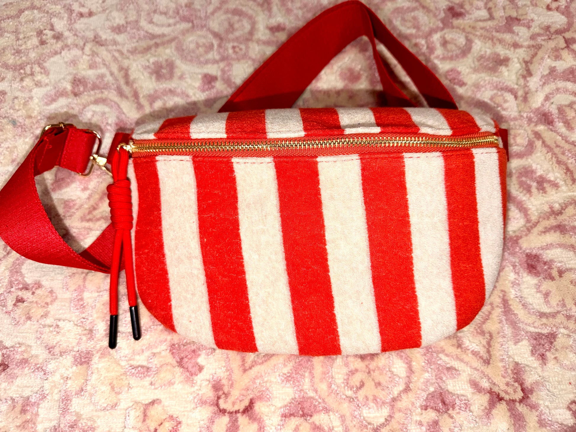 Sling this adorable terry cloth bum bag across your hips and get ready to turn heads! Featuring bold stripes in your choice of Pink, Navy, or Red, this playful accessory keeps your essentials within arm's reach. The oversized gold zipper adds a touch of glam, while the removable strap lets you wear it as a crossbody or clip it to your favorite bag. Perfect for festivals, beach days, or whenever you need hands-free style.