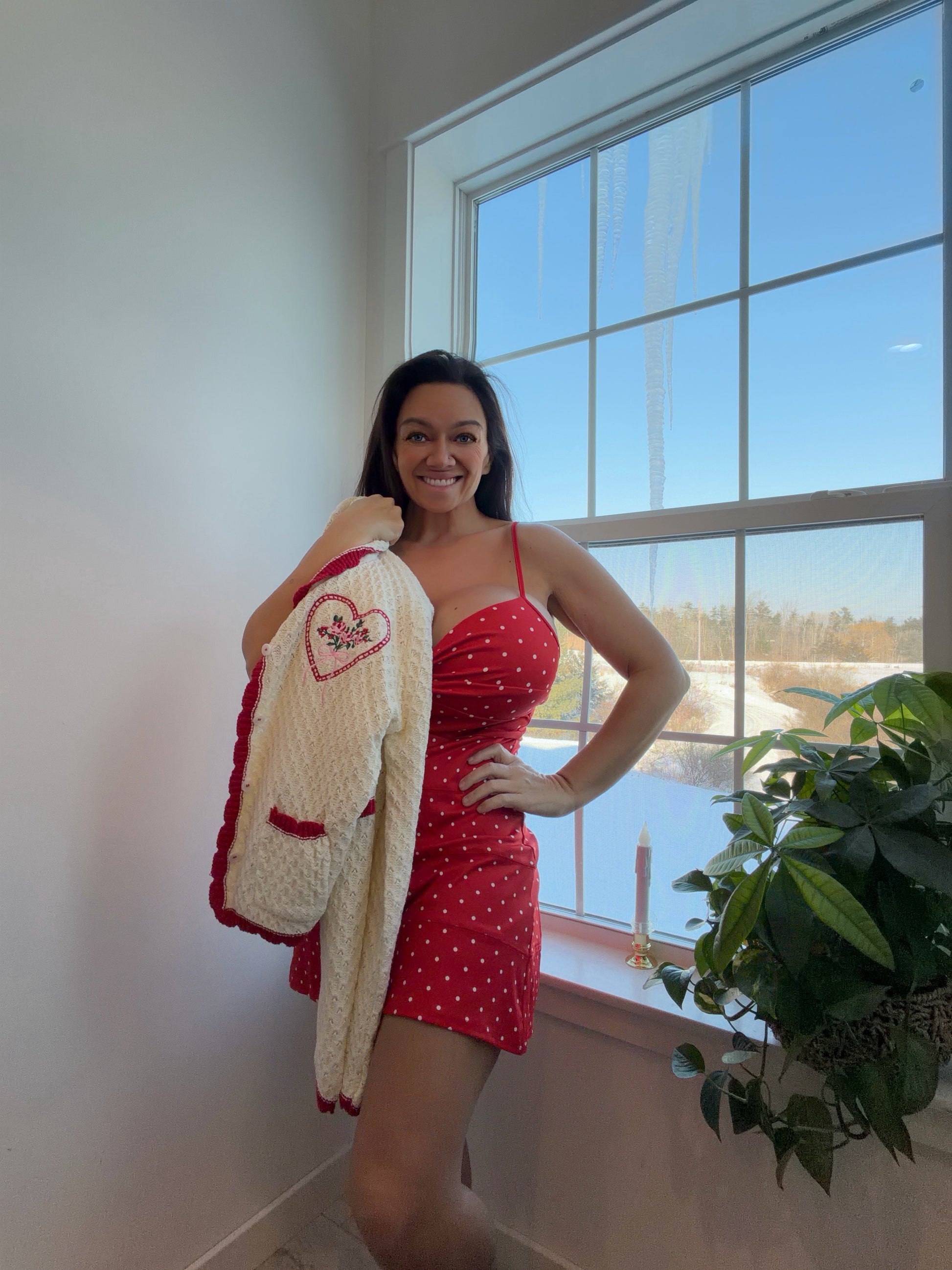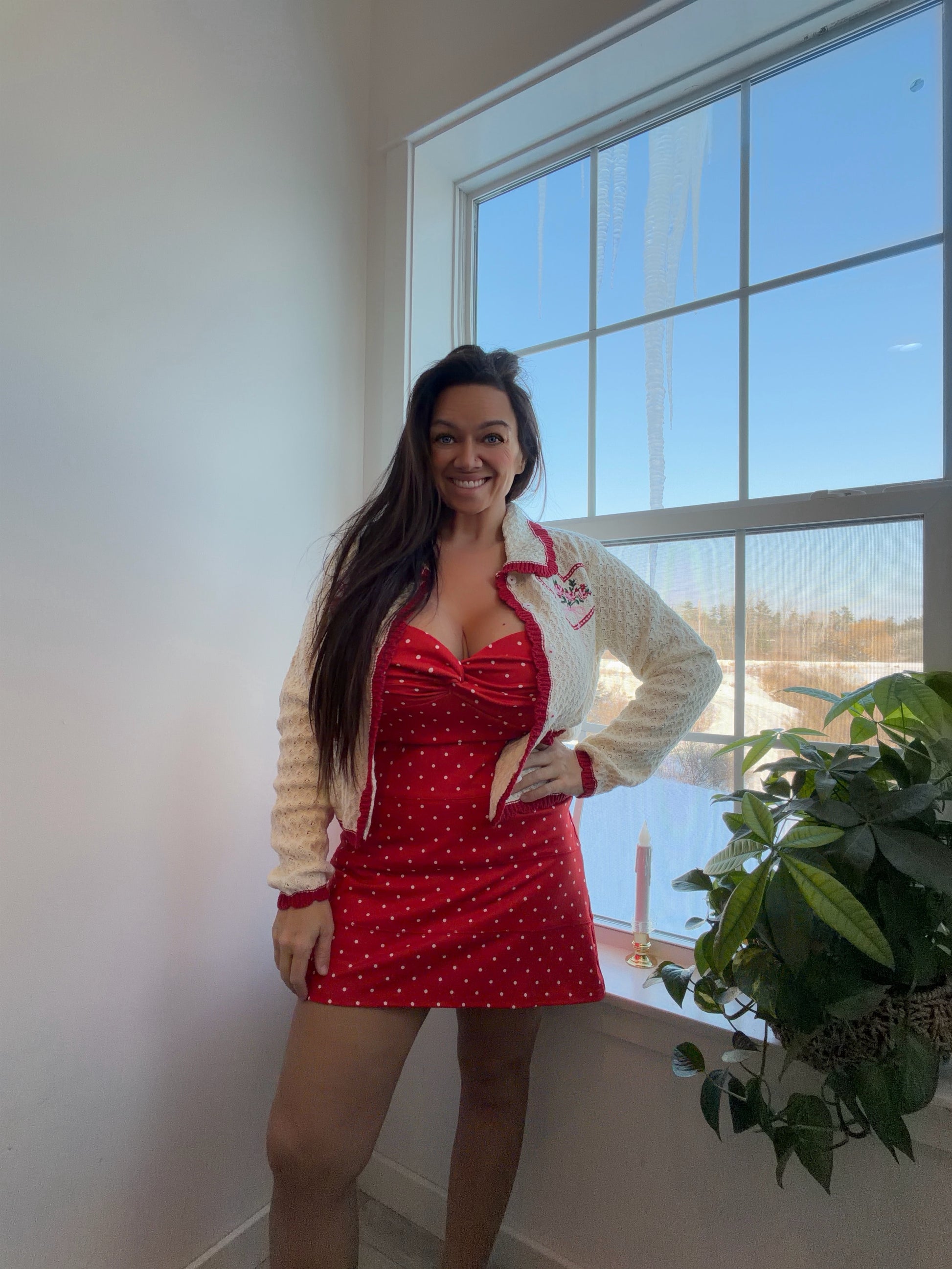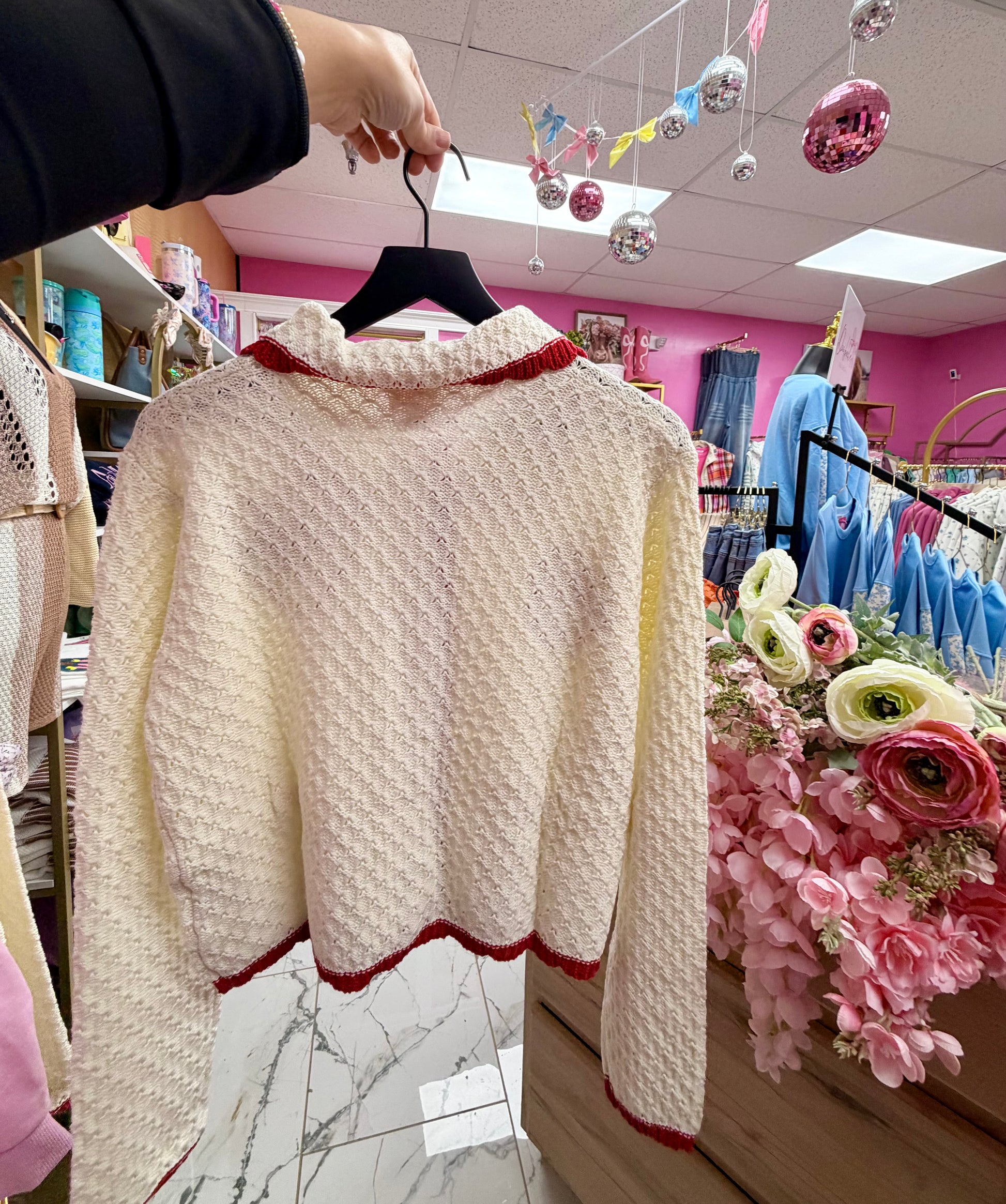 A love letter in cardigan form, this charming knit is pure vintage romance with a modern wink. Crafted in soft ivory lace-textured fabric, itβs trimmed in rich cherry-red ruffles that frame the collar, placket, cuffs, and hem like a perfectly piped pastry. The Peter Pan collar adds a sweet, storybook touch, while embroidered heart motifs and delicate florals bring a whisper of whimsy.